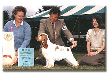 Style's first weekend out she was Best of Breed over specials from the 6-9 puppy bitch class under judge Jane Forsyth. The next shows for Style came at the Connecticut ECSCA National in 1985. Day one she went Best in Sweeps from the 6-9 puppy bitch class, under judge Mary Ann Alston.