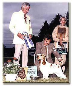 Day two she went Best of Winners from the 9-12 puppy bitch class, judge Mr. James Edward Clark.  Style next went to Santa Barbara and was Best of Breed over a large entry to finish, under breeder judge Ginny Lyne. Style won an "Award of Merit" at the 1988 English Cocker Spaniel National Specialty.